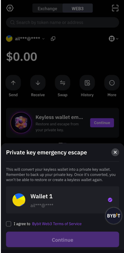 選擇您的 MPC 錢包,然後使用 Bybit 錢包服務條款進行確認,然後點擊「繼續”,將您的 MPC(無密鑰錢包)轉入種子短語。