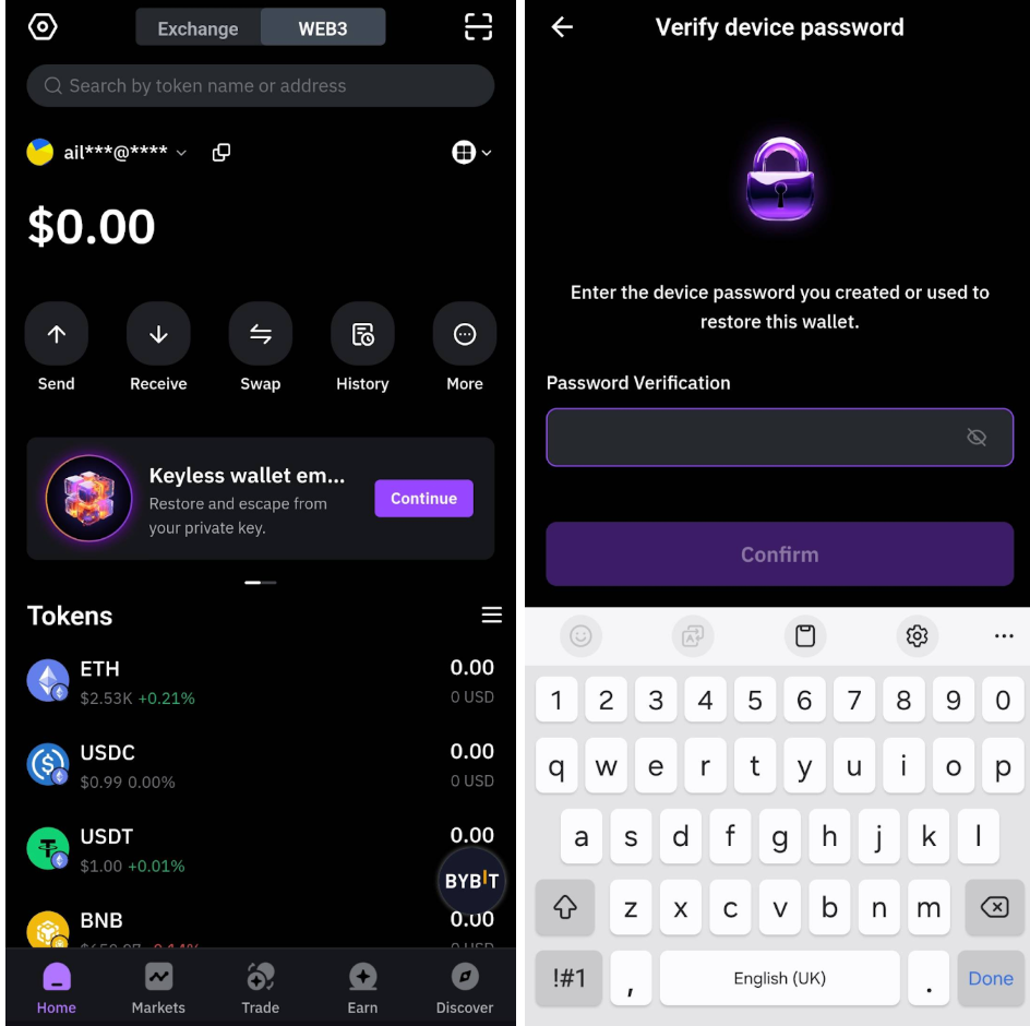 請登入應用程式 MPC (Keyless Wallet), 您將在錢包上看到橫幅。點選私鑰緊急逃生橫幅上的繼續,然後使用您的裝置密碼進行驗證。