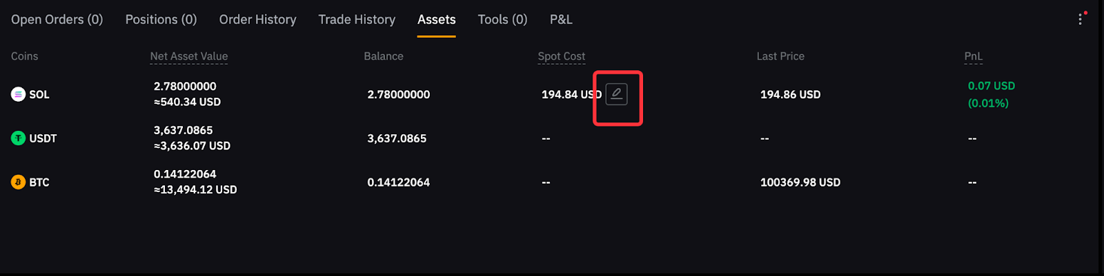 第 1 步:滑動至頁面底部的資產,點擊現貨成本價數值旁邊的編輯圖標。