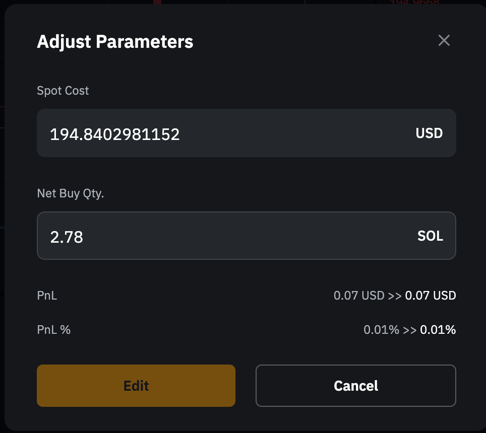 參數修改 | - 當資產餘額大於 0 時,可對現貨成本價進行修改。