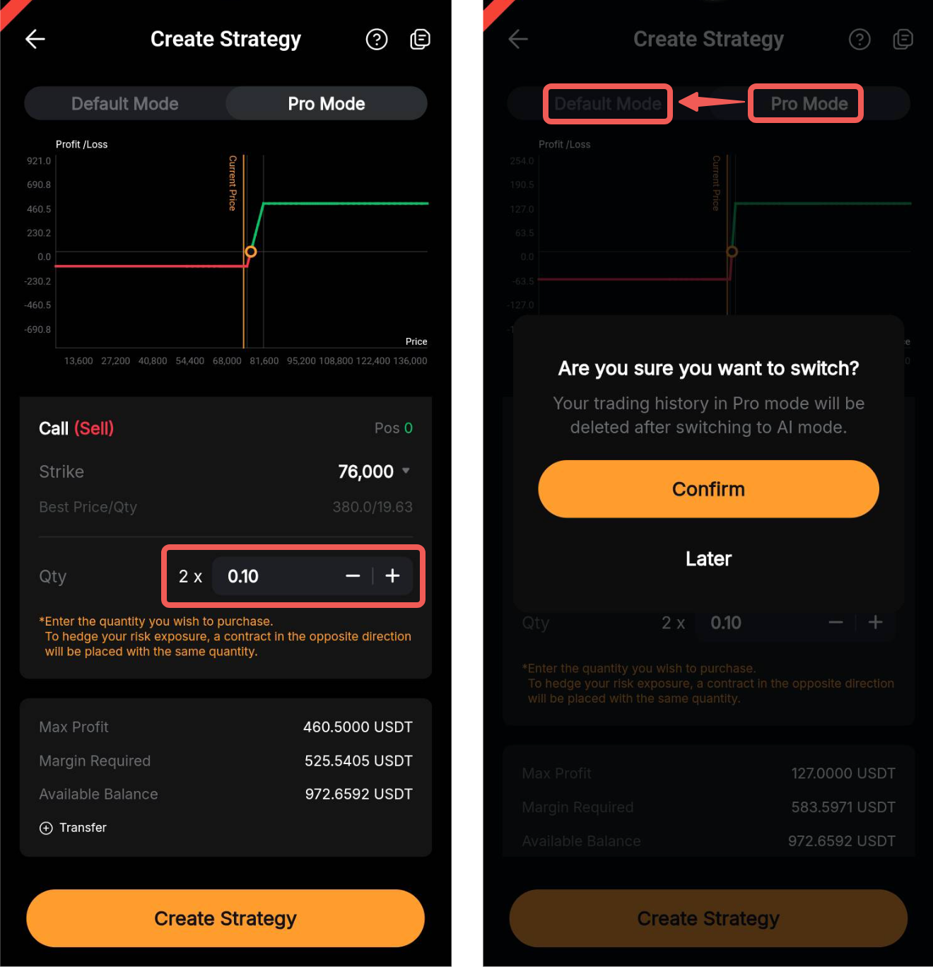 — 可用的選擇權交易對有不同的預設數量,您可以在預設模式和專業模式中自由設定數量。然而,從專業模式切換回預設模式將會重設您的訂單參數和買入數量。
