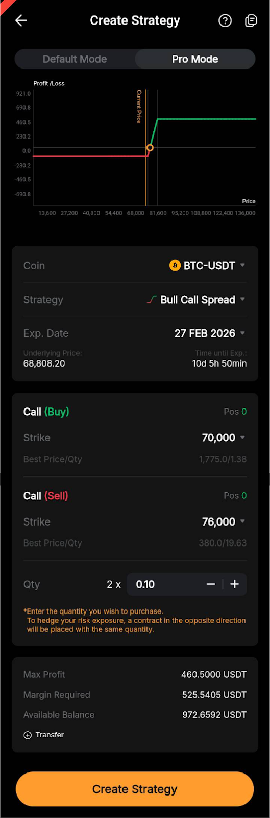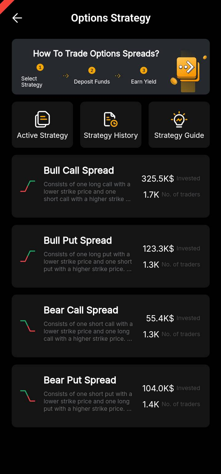 Bybit App 上的期權策略功能提供可自訂的交易預設,讓您輕鬆投資看漲和看跌期權市場。透過此功能,您只需簡單操作即可執行各種做多和做空期權交易策略。
