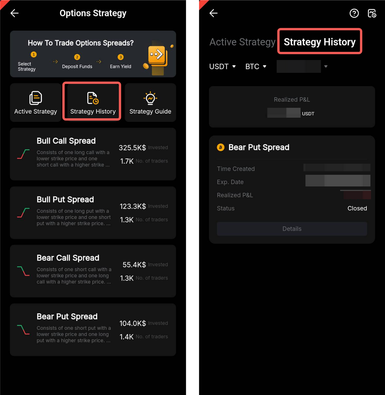 您可以在 策略歷史 中查看歷史策略詳情,包括所有歷史策略的已實現盈虧。若要深入了解您的歷史策略,請點擊詳情。