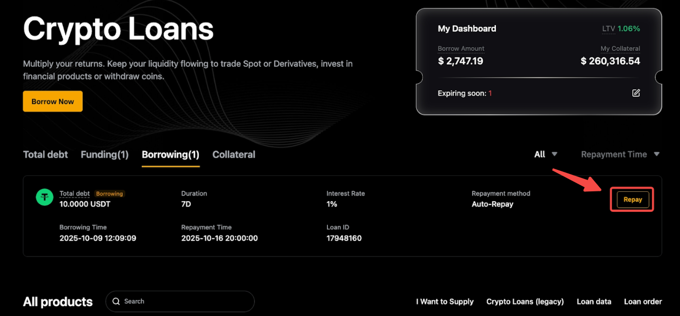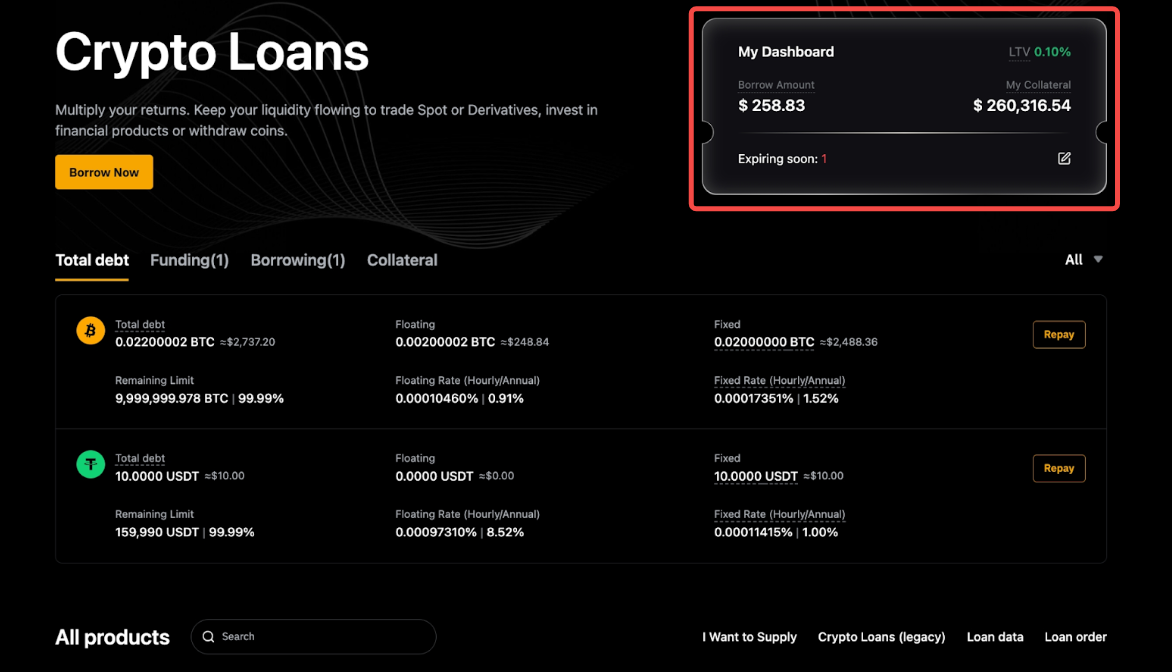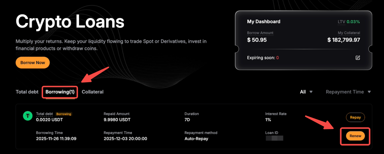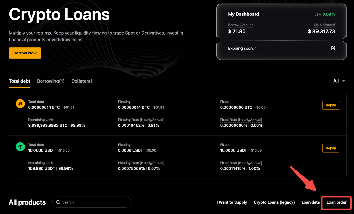 要查看您的借幣詳情,請前往加密貸款首頁,您將看到所有借幣、抵押資產和訂單。