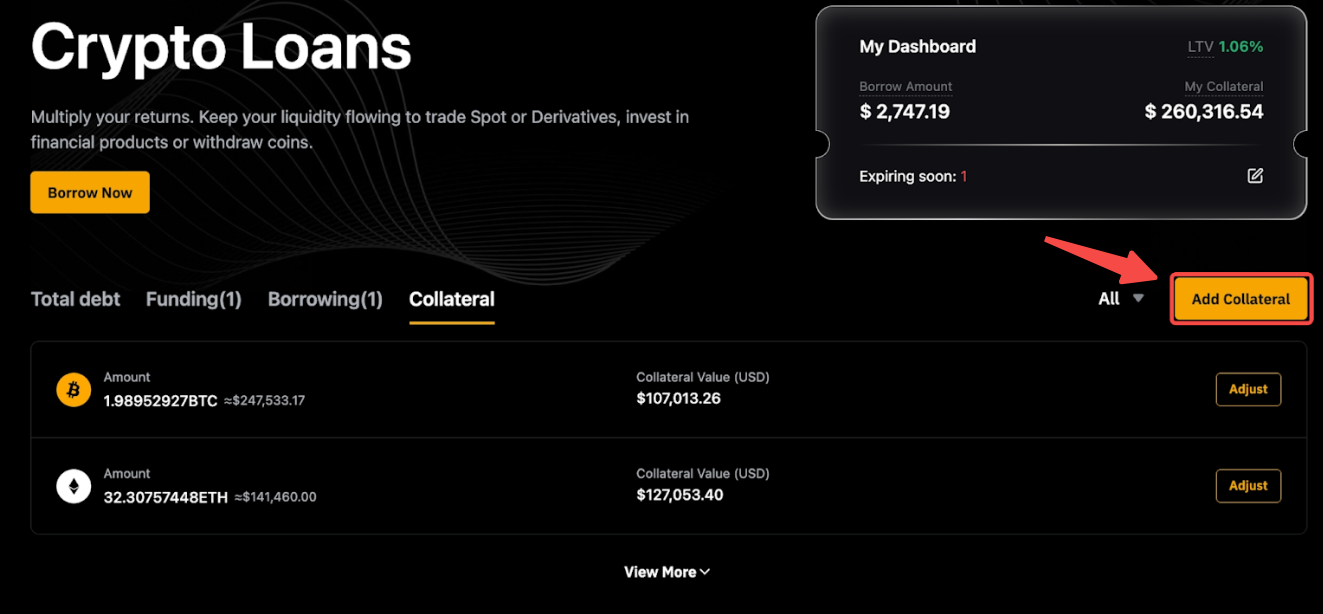 - 抵押資產 — 列出所有抵押資產及其數量和 USD 價值。點擊調整修改您的抵押品。