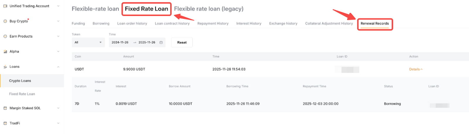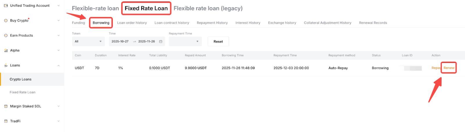 若要查看您的續期記錄,您可以按一下概覽面板 → 定期借幣 →續期記錄下的借幣訂單。