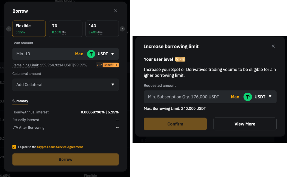 - VIP 權益:對於 VIP 用戶,您可以點擊 VIP Benefits,提升借幣上限。