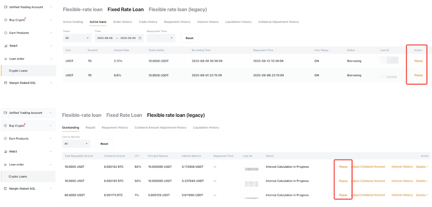 第 2 步:如果您因定期借幣和活期借幣而產生任何負債,您可以前往「全部」部分償還負債。否則,您可以切換到「活期」或「定期」部分進行還款。請注意,系統將首先償還活期負債,然後償還定期負債。