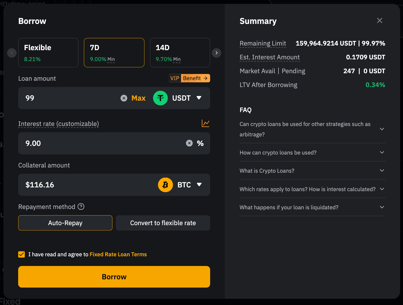 注意:借幣金額是固定的,無法調整。
