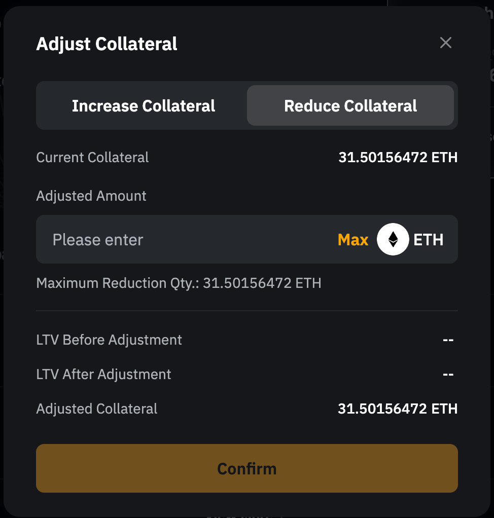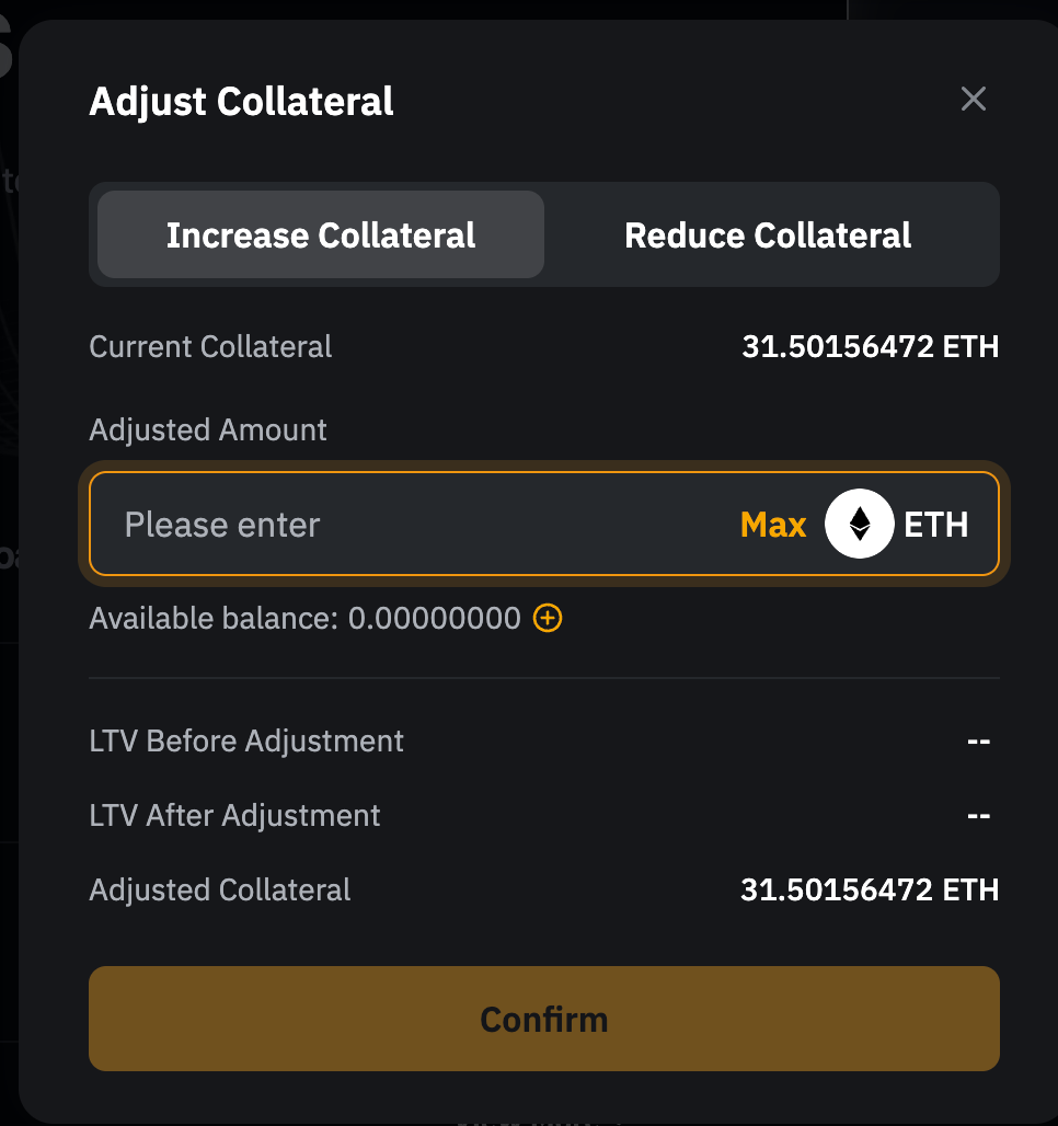 步驟 2: 要調整抵押品金額,請前往抵押資產選項卡,輸入追加的金額;或點擊最大,使用資金賬戶全部可用餘額。追加抵押資產將降低您的 LTV,減少強平風險。