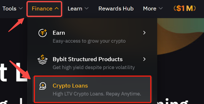 第 1 步:登錄Bybit 官網,在導航欄中點擊金融 → 質押借幣,訪問質押借幣頁面。