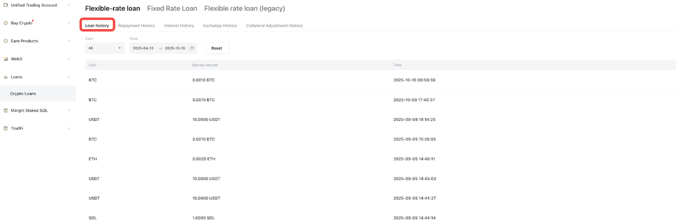 要查看您所有訂單的完整列表,請點擊總覽面板下的借幣訂單。您可以切換頂部的產品選項卡,查看所有質押借幣訂單,包括活期負債和定期負債,詳細了解您的包含借款、還款、利息、抵押資產等詳細信息,還支援按資產類型或時間範圍進行篩選查詢。