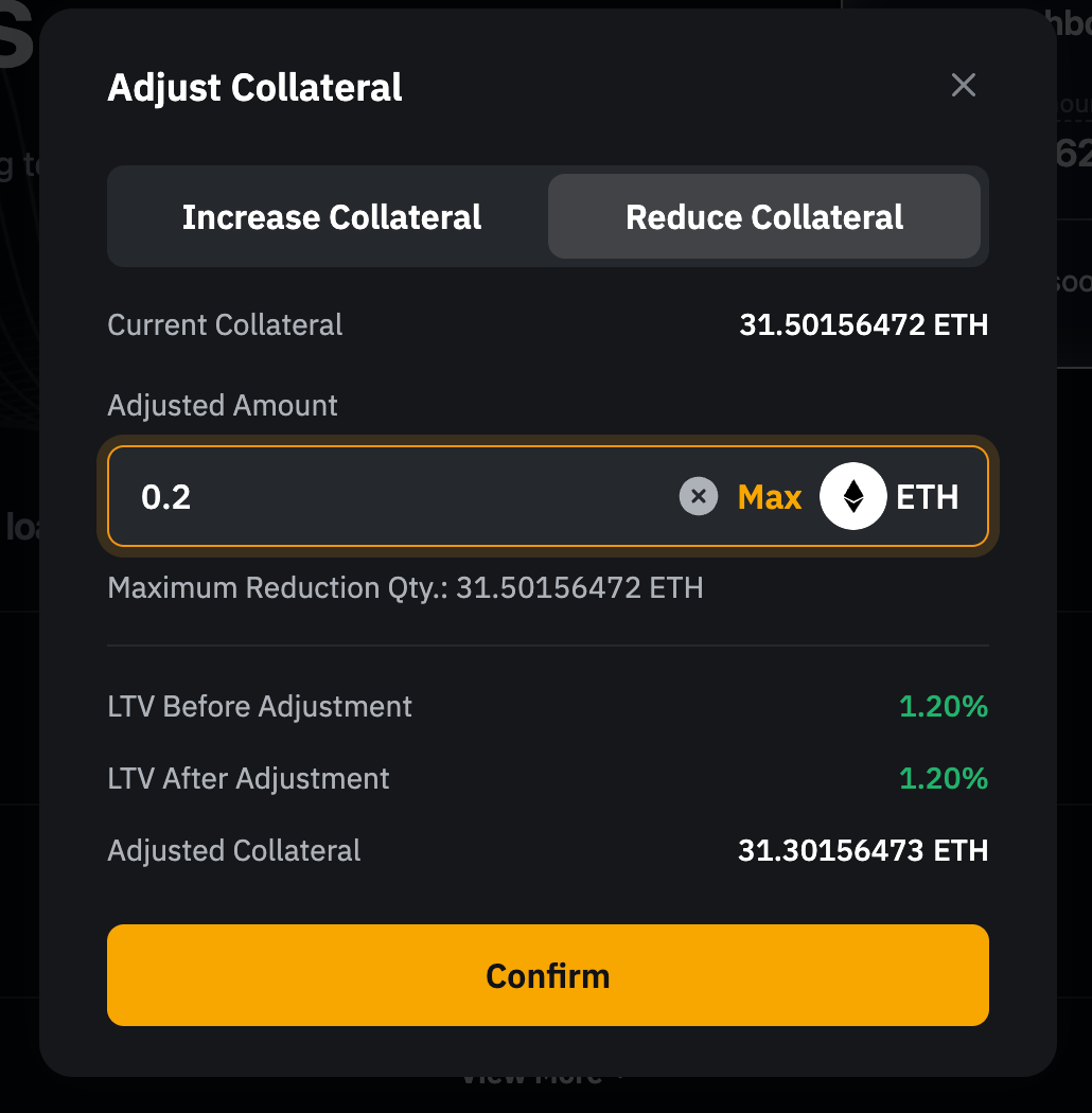 如需移除抵押資產,可點擊減少抵押資產標籤頁,輸入需要撤回的金額;或點擊最大,移除最大可減金額的抵押資產。