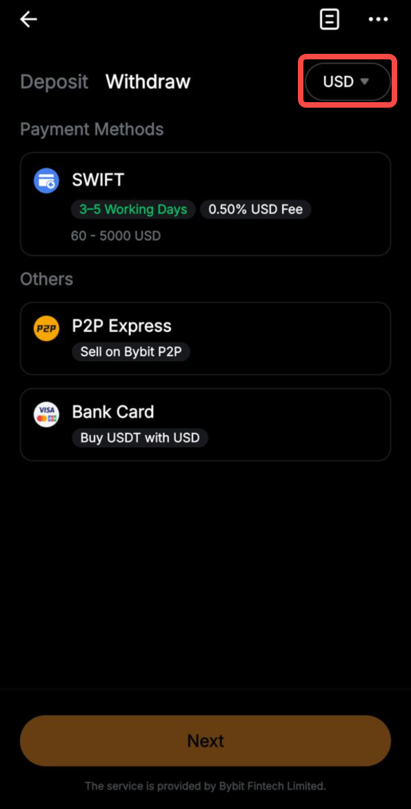 Bybit 法幣充值功能支持多種法幣,您可以通過法幣餘額輕鬆實現即時交易。不同法幣的充值流程略有不同。欲了解詳情,請點擊此處。