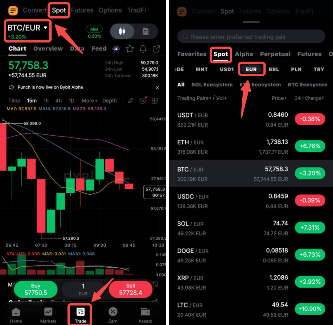請在導航欄中點擊交易 → 現貨交易,然後選擇相應法幣開始交易。
