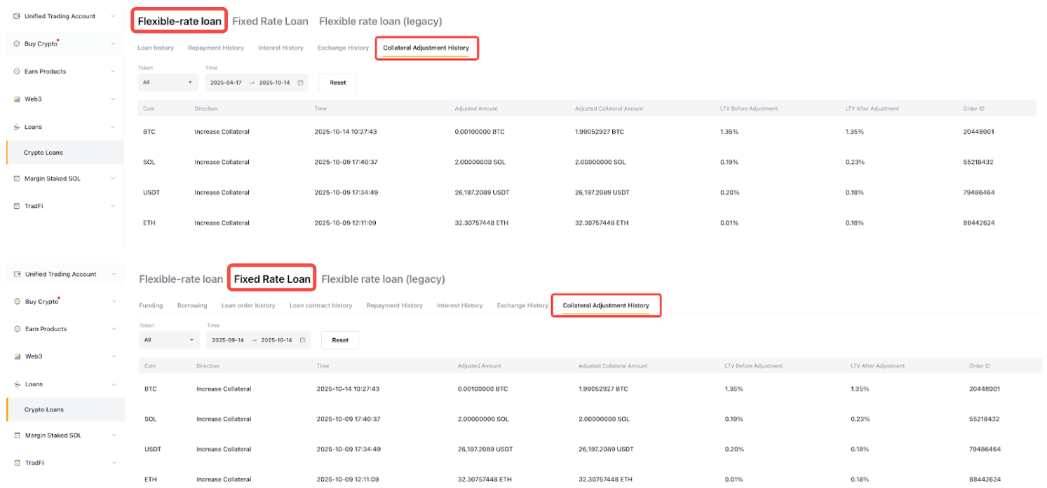 您可以從活期/定期負債歷史記錄 → 抵押品調整記錄中查看 LTV 比率的變化。