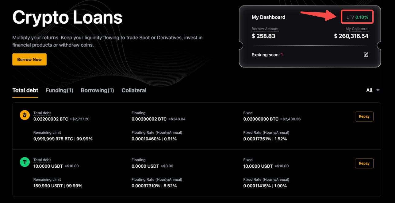 強平 LTV:當 LTV 高於強平 LTV 時,Bybit 會強制平倉抵押資產並全部用來償還貸款和利息。請注意,當達到相應的強平 LTV 時將觸發強平。