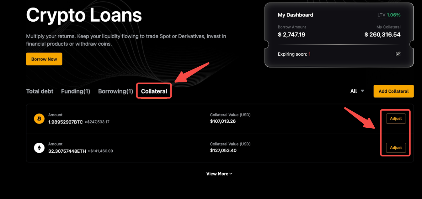 或者,點擊頁面右上角的資產→質押借幣。在質押借幣標籤下,按一下您要調整的列中的調整抵押品金額。