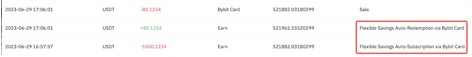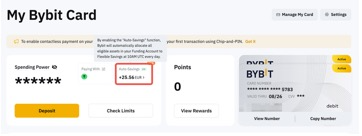 كما يمكنك كسب فائدة تراكمية على توفيرك المرن (غير متاح مباشرة على صفحة ادخارات Bybit) من خلال تفعيل الخصم التلقائي على لوحة تحكم بطاقة Bybit!