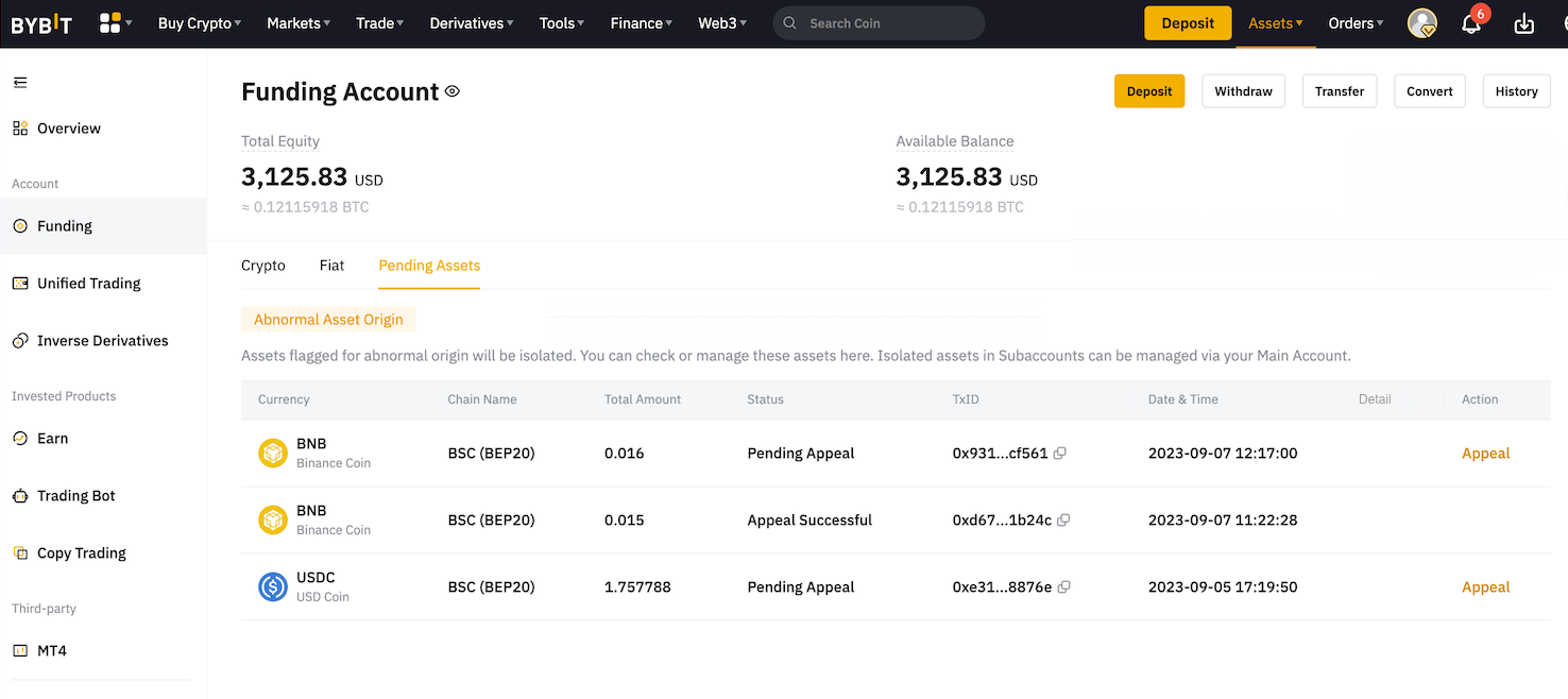وقد وضعت Bybit حدًا ائتمانيًا للإيداع اليومي لكل بلوكشين معين. ستبقى الإيداعات التي تتجاوز هذا الحد مؤقتًا كأصول غير قابلة للتداول، ويمكن الاطلاع عليها في قسم الأصول المعلقة في صفحة حساب التمويل