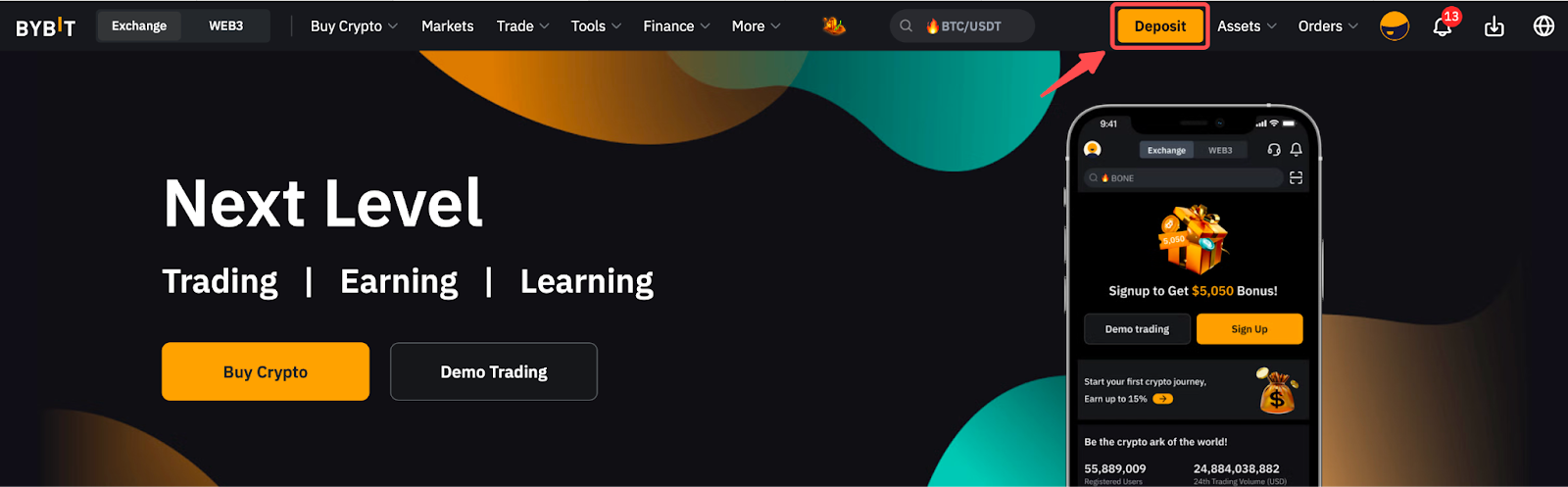 يمكنك أيضًا تحديد موقع مدخل الإيداع في الزاوية اليمنى العليا من صفحة Bybit.