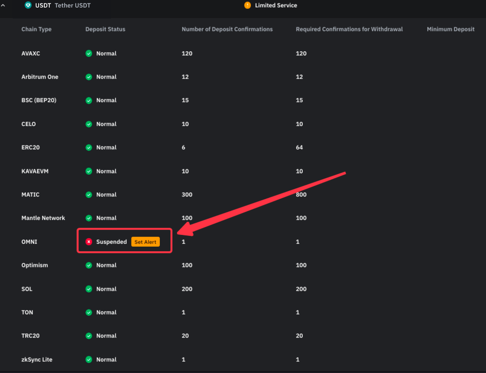 بدلاً من ذلك، يمكنك الانتقال إلى صفحة حالة الإيداع/السحب والبحث عن الرمز المميز والسلسلة. سيظهر زر تعيين تنبيه بجوار حالة الإيداع "معلق".
