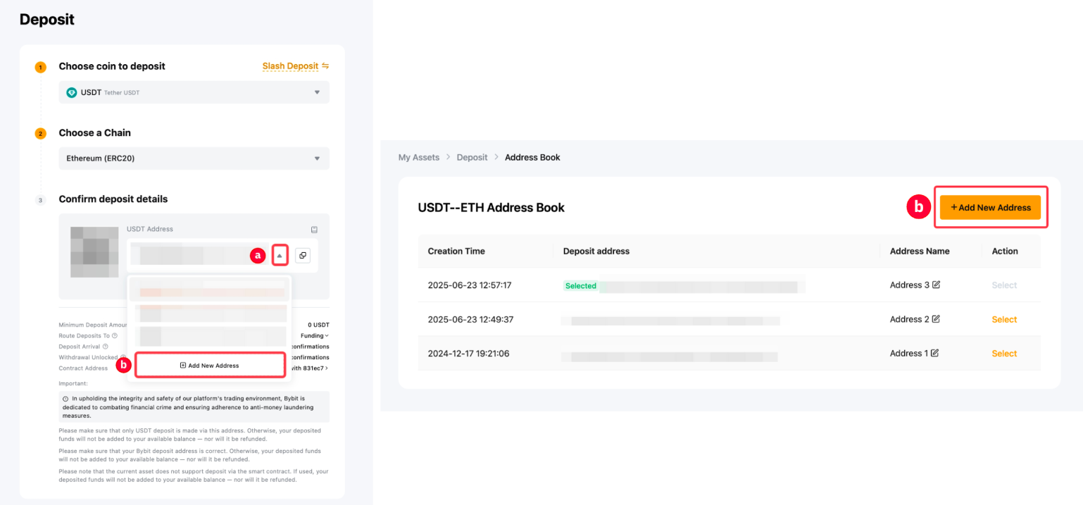 يمكنك إدارة العناوين في دفتر العناوين لتعيين اسم العنوان أو تعيين العنوان المفضل في الخيار العلوي لصفحة الإيداع الخاصة بك.