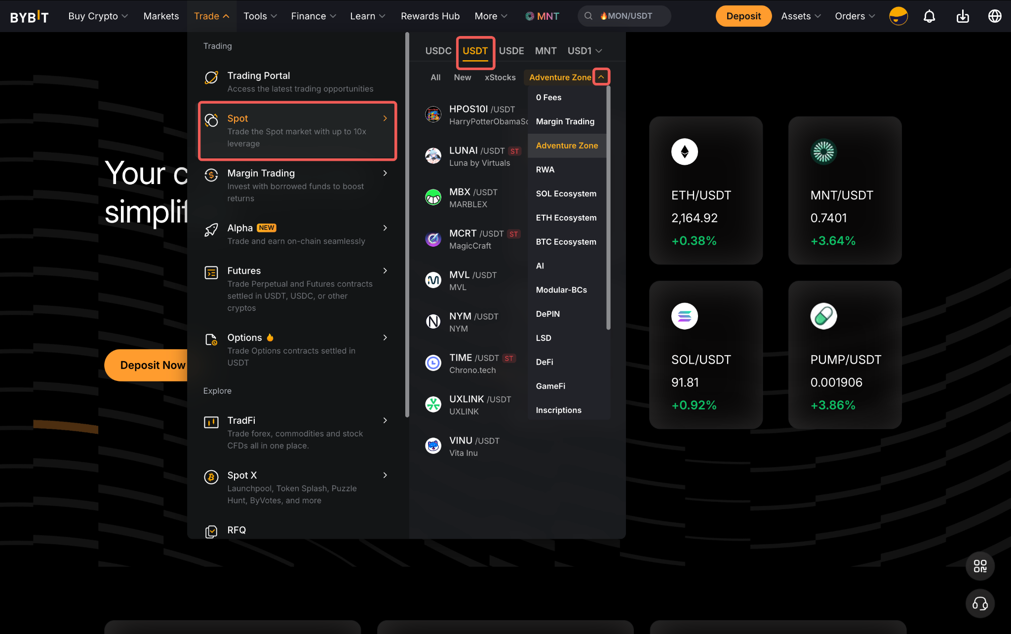 To access the Adventure Zone and its trading pairs, click Trade → Spot, and in the dropdown menu under USDT, select Adventure Zone.