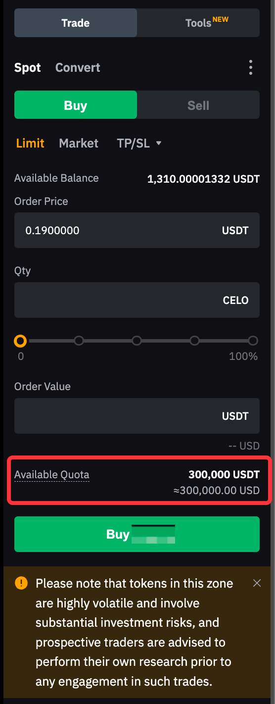 You can find this information on the Available Quota section of the trading page. For example, if the available quota for coin ABC is 300,000 USDT and the price of coin ABC is 0.5 USDT, the maximum quantity of coin ABC that you can hold in your account is 600,000 coins (calculated as 300,000 USDT ÷ 0.5 USDT = 600,000 coins).