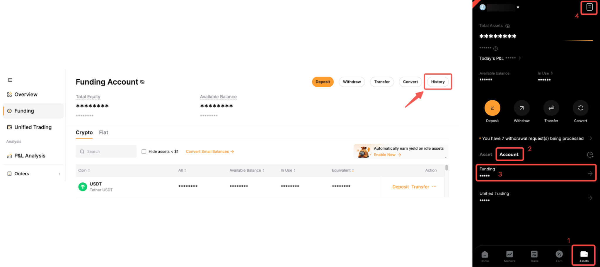 App — Go to the Asset History page by tapping on Assets → Funding Account → History icon in the top right corner.