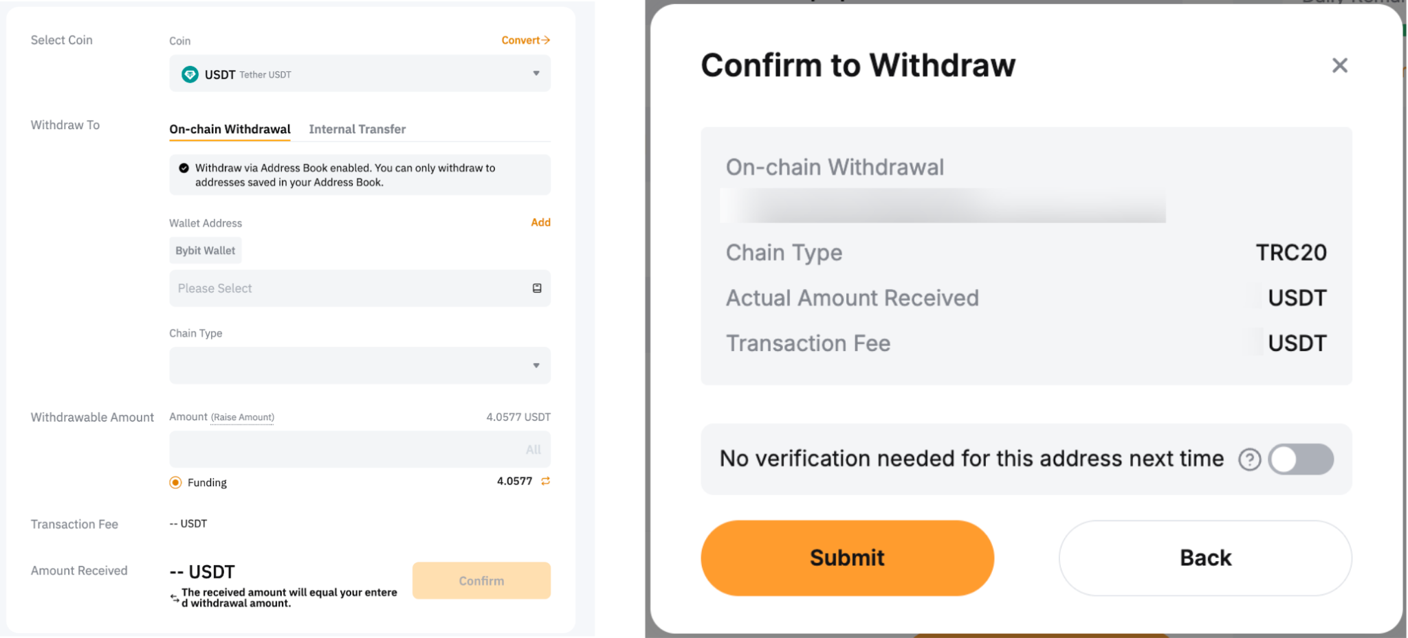 Step 1: On the Withdrawal page, select coin type, wallet address, chain type and withdrawal amount to withdraw as per usual.