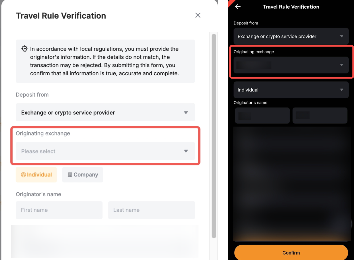 1. If the deposit is from an Exchange or crypto service provider, select the Originating exchange. If the originating exchange is not listed, you may select Other and enter the exchange’s name manually.