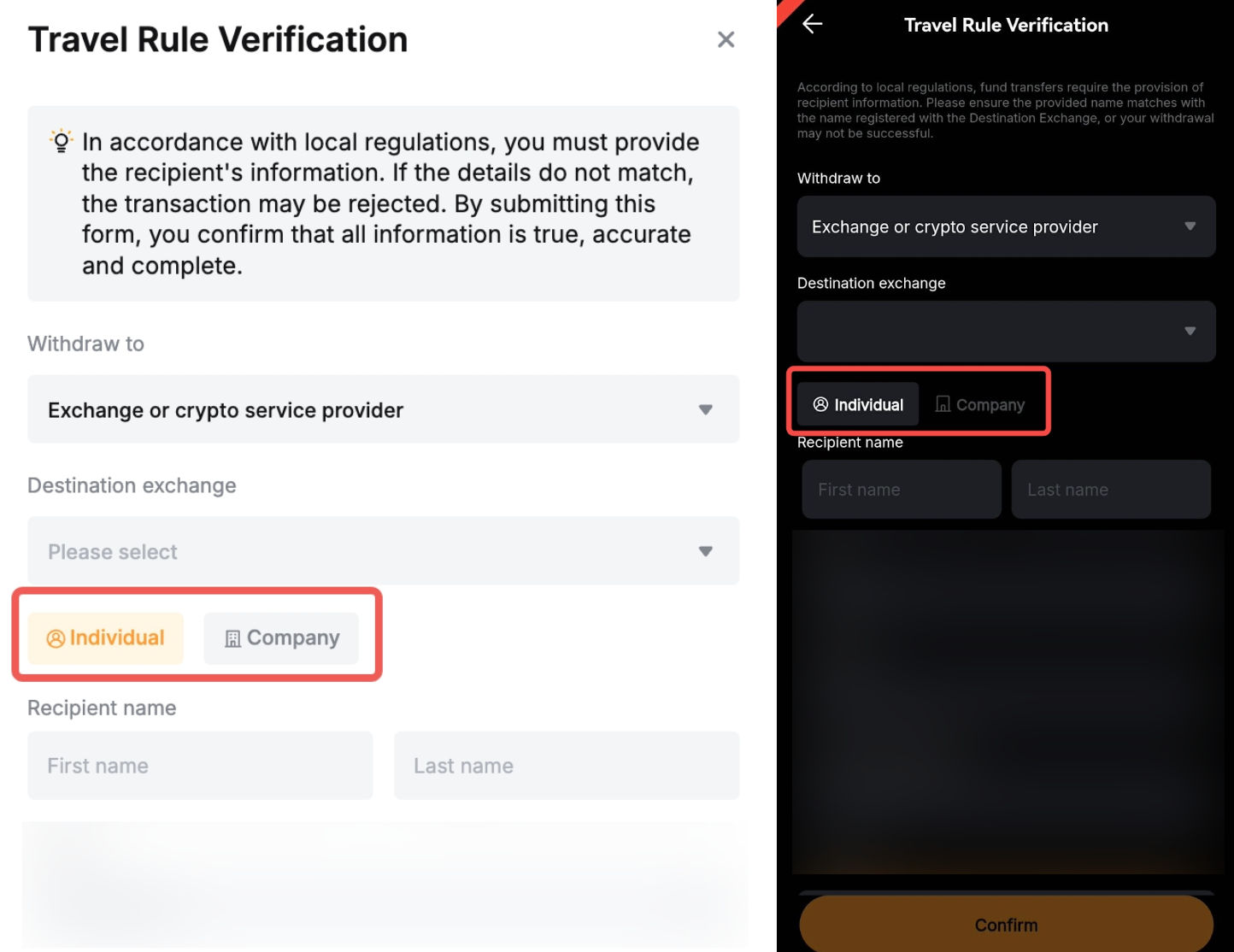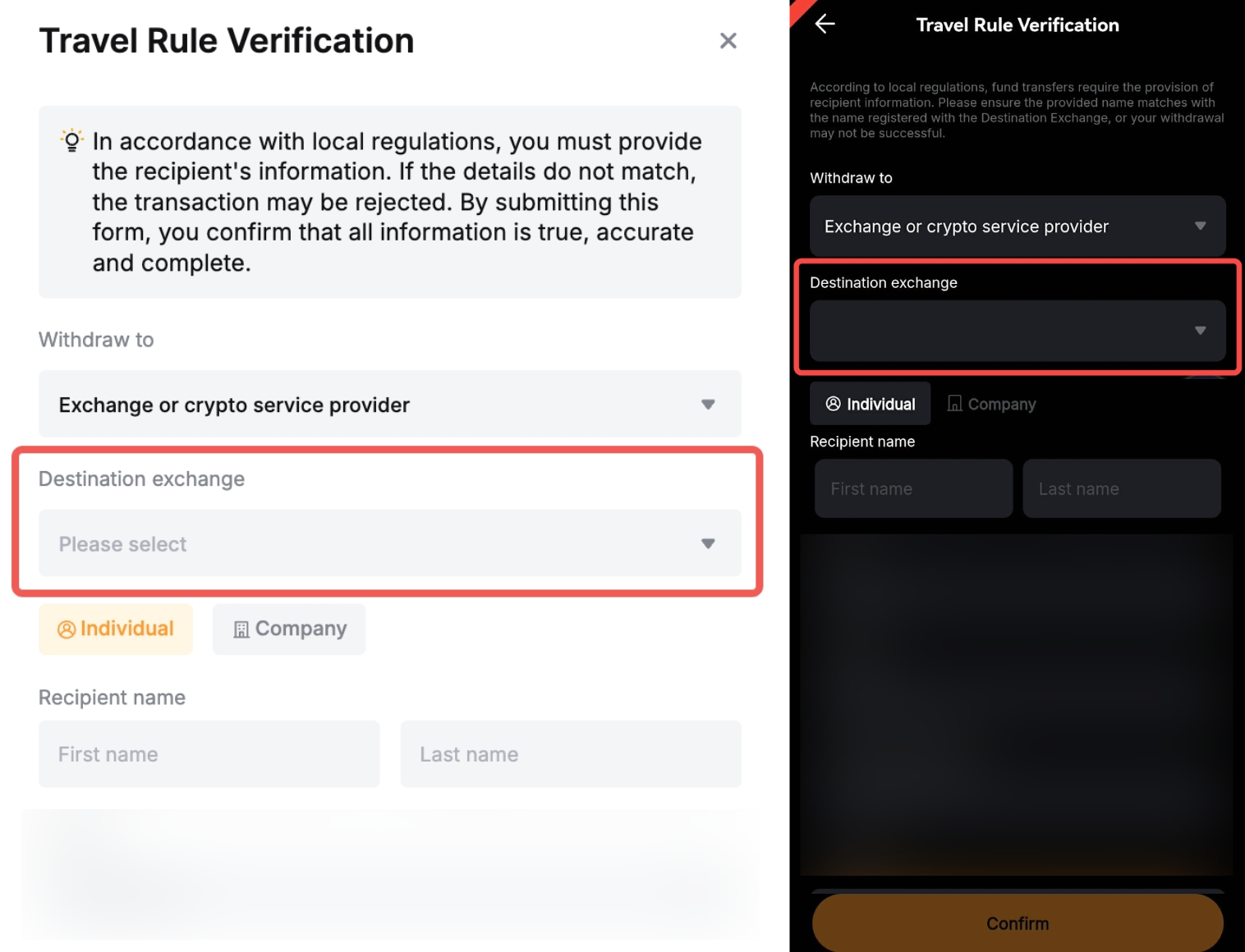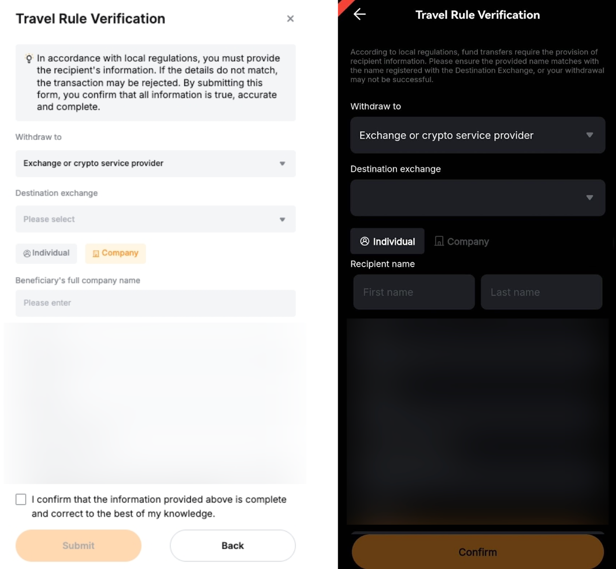 Step 2: The Travel Rule Verification window will pop up after you submit the withdrawal request. Please provide the withdrawal details as outlined below: