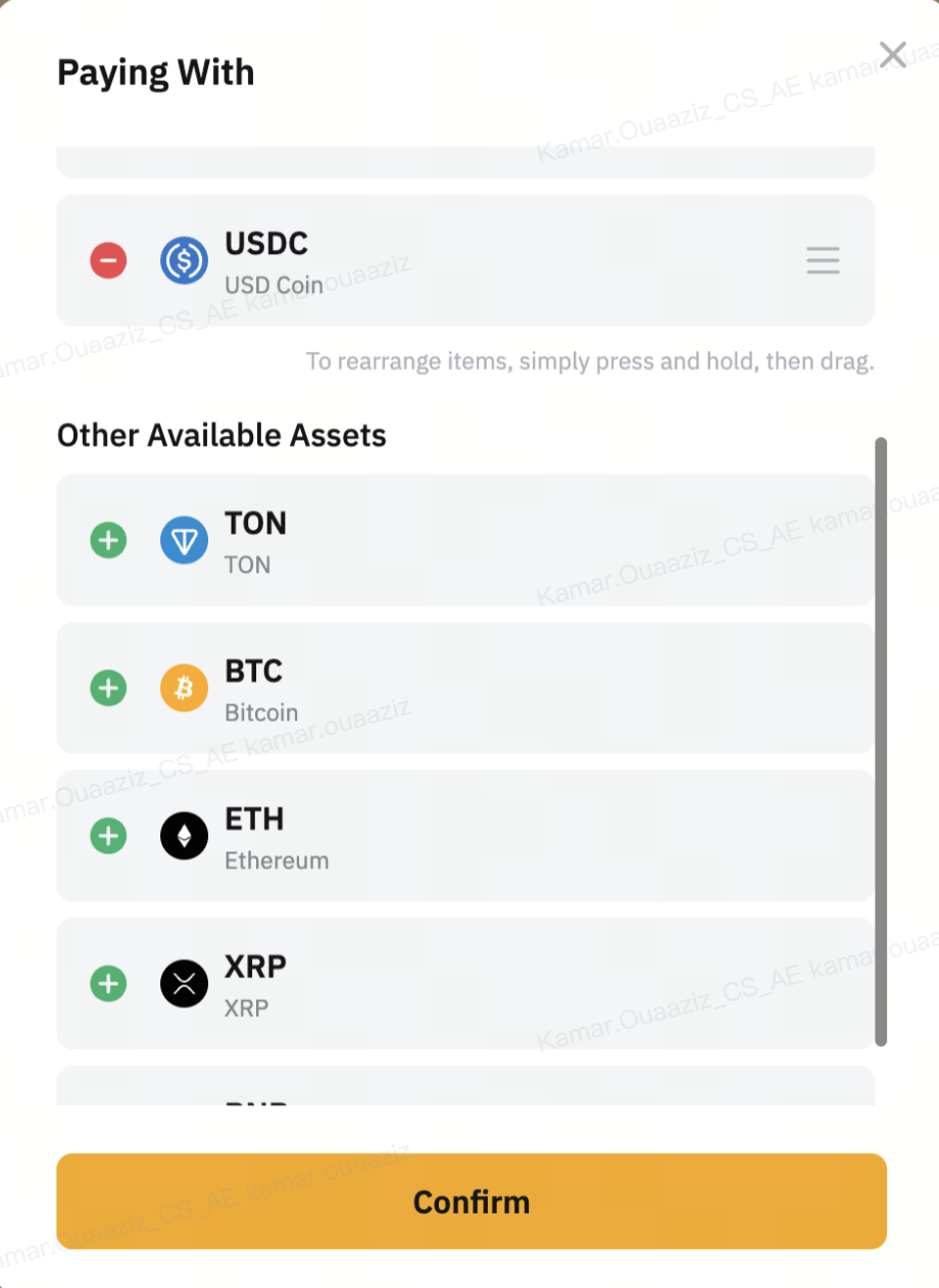 يمكنك اختيار ما يصل إلى 3 أنواع من العملات المشفرة للدفع في معاملات بطاقتك Bybit والأولوية الافتراضية للدفع هي USDT > USDC > BTC. قم بتخصيص تفضيلاتك على لوحة التحكم بالبطاقة بالنقر على الدفع باستخدام. يمكنك إعادة ترتيب الأولوية أو إضافة/إزالة العملات. سيتبع النظام أولويتك في الدفع أثناء المعاملات.