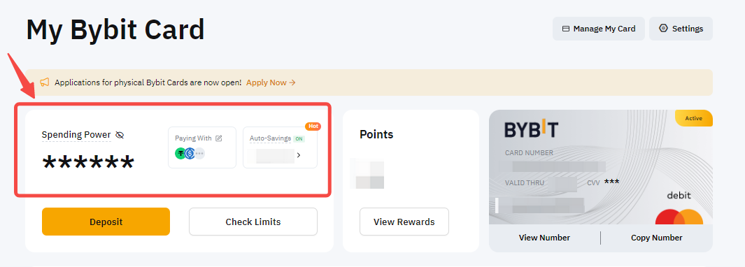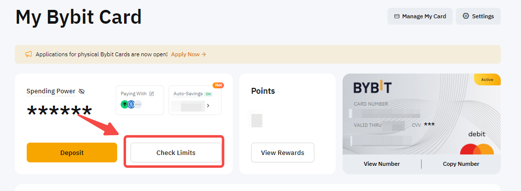 يرجى التوجه إلى صفحة بطاقتي Bybit وانقر على تحقق من الحدود.