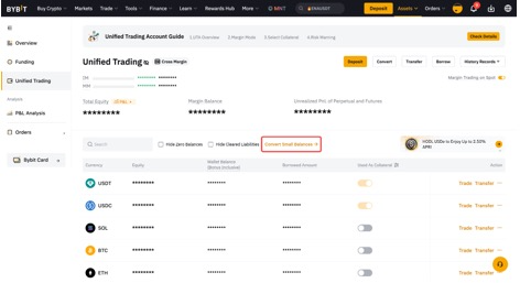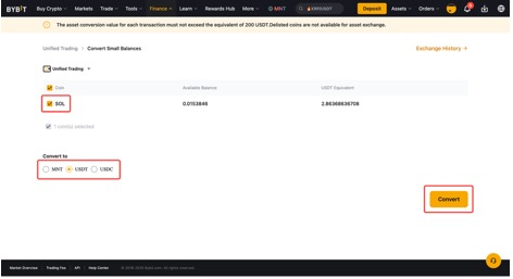 لتحسين استخدام الأصول الصغيرة في حسابك على Bybit، يمكنك تحويل أي أصول تقل قيمتها عن 0.001 BTC أو ما يعادلها إلى MNT، USDT، أو USDC في عملية تحويل واحدة باتباع أربع خطوات بسيطة. يدعم تحويل الأرصدة الصغيرة باستخدام كلاً من حساب التمويل وحساب التداول الموحد (UTA). يرجى ملاحظة أن تحويل الرصيد الصغير يقتصر على مرة واحدة كل ساعة واحدة.