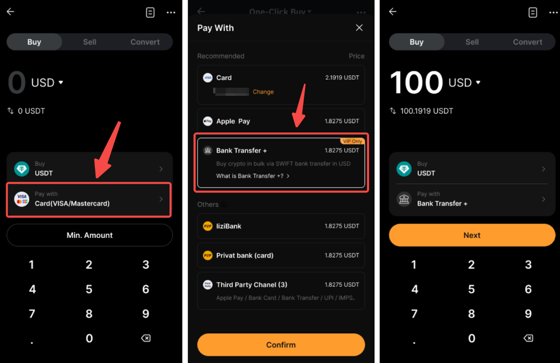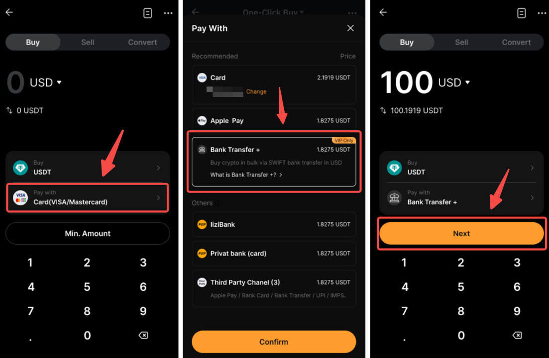 – تخضع عمليات التحويل لحدود لكل معاملة، وحدود يومية، وشهرية بناءً على مستوى VIP الخاص بك. يرجى الرجوع إلى صفحة التحويل للحصول على المزيد من التفاصيل.