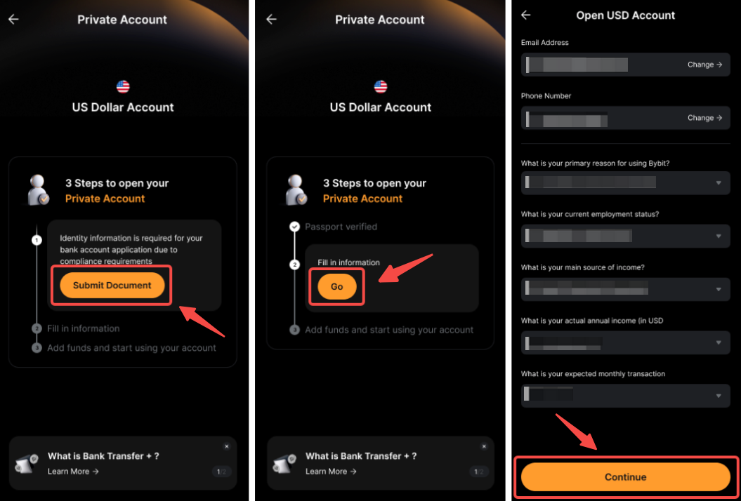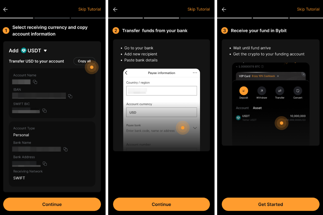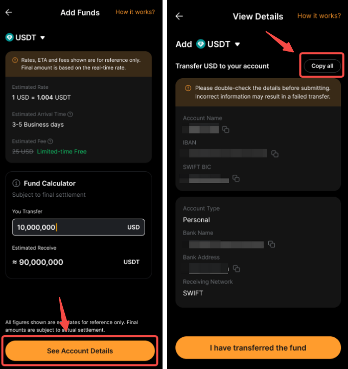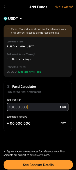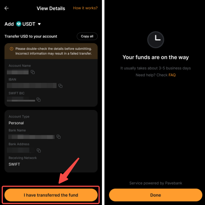 بعد إعداد الحوالة البنكية +، يمكنك تحويل العملات النقدية من حسابك في البنك واستلام USDT أو USDC في حساب التمويل الخاص بك.