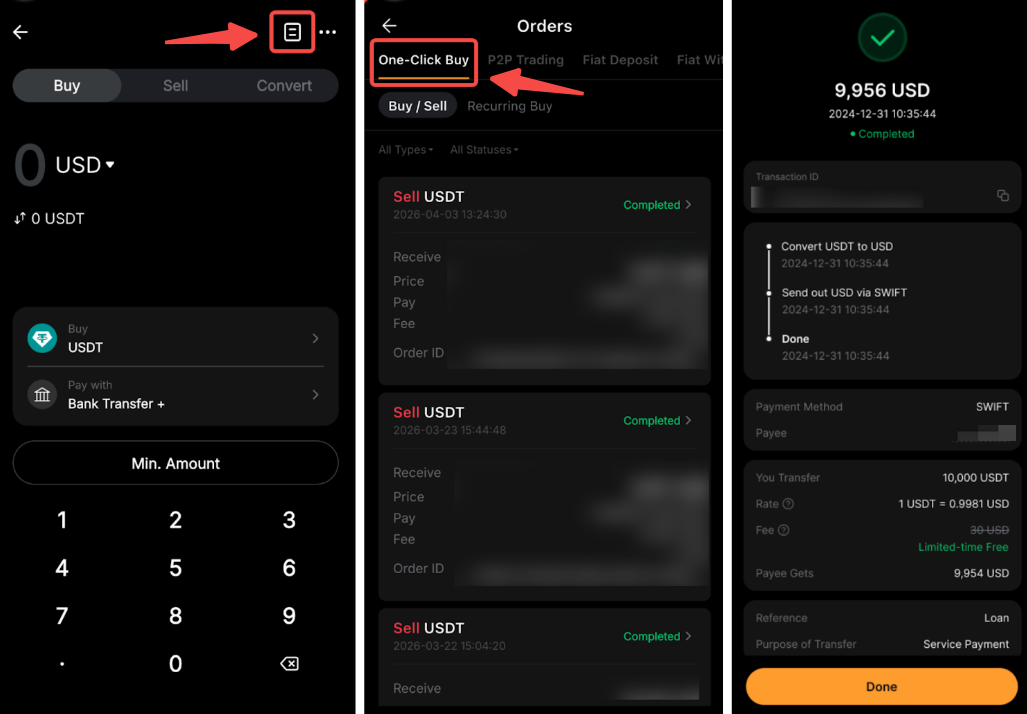 للتحقق من حالة الحوالة، انتقل إلى صفحة شراء تشفير واضغط على أيقونة تاريخ ← علامة تبويب الشراء بنقرة واحدة . بعد ذلك، حدد معاملة حوالة بنكية ذات الصلة من أجل اعرض المزيد من التفاصيل.