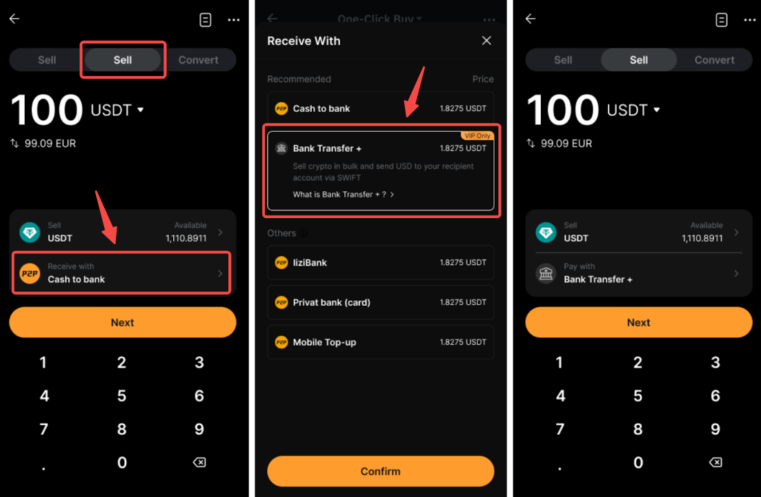 الخطوة 1: انطلق إلى شراء تشفير الصفحة وقم بالتبديل إلى بيع علامة التبويب. تأكد من ضبط طريقة الاستلام الخاصة بك على حوالة بنكية +، ثم اضغط على التالي للمتابعة.