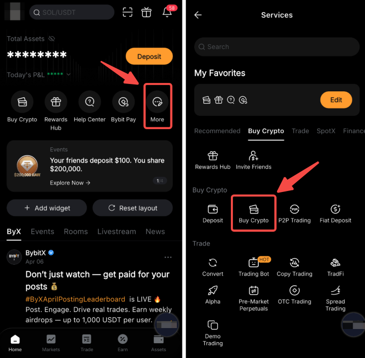 الخطوة 1: في صفحة الصفحة الرئيسية على تطبيق Bybit الخاص بك، اضغط على المزيد ← شراء تشفير.