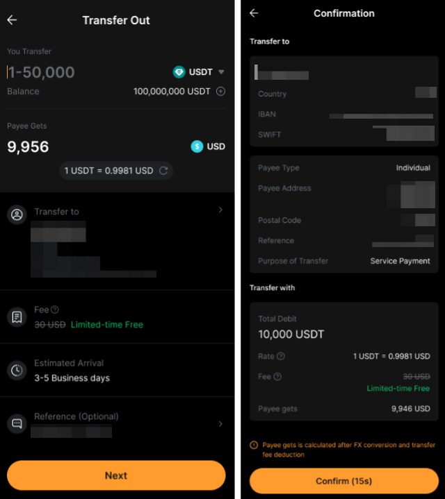 مع خدمة حوالة بنكية +، يمكنك سحب عملات USDT أو USDC الخاصة بك كعملات نقدية مباشرة إلى حساب بنكي خارجي.