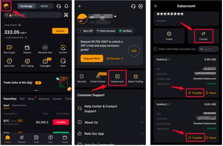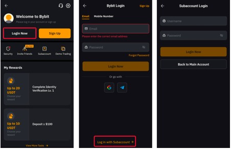 — تم تسجيل الدخول إلى حسابك الفرعي من خلال صفحة تسجيل الدخول باستخدام اسم المستخدم وكلمة المرور الخاصة بك في Bybit. في هذه الحالات، سيتم دعم التحويلات فقط إلى الحساب الرئيسي أو داخل نفس الحساب الفرعي.