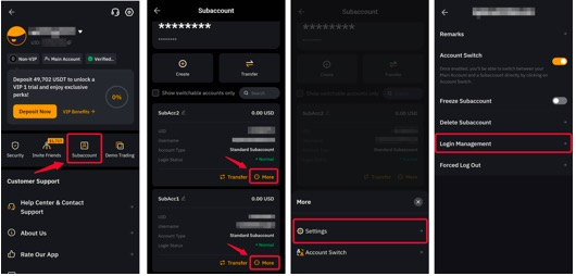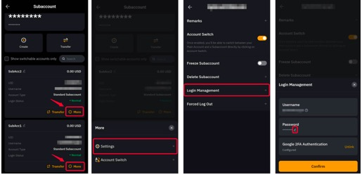 يرجى ملاحظة أنه إذا قمت بإنشاء حساب فرعي قياسي بدون إعدادات كلمة مرور، يمكنك تسجيل الدخول فقط عبر تبديل الحساب من حسابك الرئيسي. لتفعيل تسجيل الدخول عبر صفحة تسجيل الدخول في Bybit، يرجى الاتصال بحسابك الرئيسي، وفي صفحة الحساب الفرعي، حدد حسابك الفرعي واضغط على المزيد → الإعدادات → إدارة تسجيل الدخول. يمكنك الآن استرجاع اسم مستخدم الحساب الفرعي وتعيين كلمة مرور جديدة.
