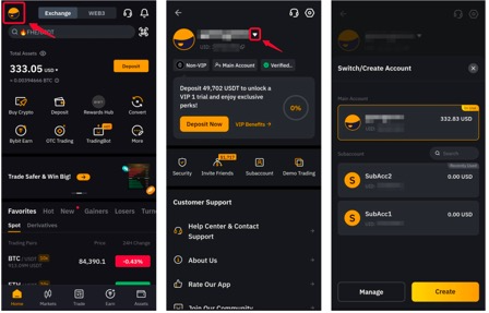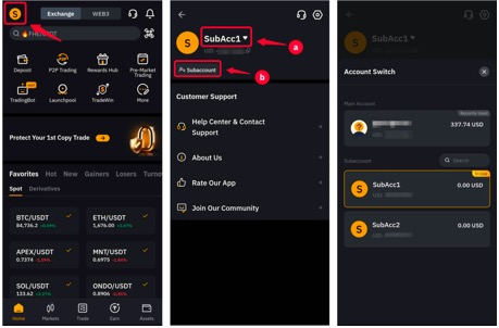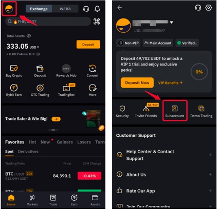 الخطوة 1 : قم بتسجيل الدخول إلى تطبيق Bybit واضغط على أيقونة الملف الشخصي في الزاوية العلوية اليسرى للوصول إلى علامة تبويب الحساب الفرعي.