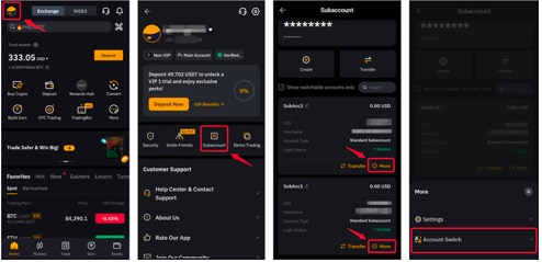 الطريقة 3: اضغط على صورة ملفك الشخصي في الزاوية العلوية اليسرى من الصفحة الرئيسية وافتح صفحة الحساب الفرعي. ابحث عن الحساب الفرعي الذي تريد فتحه واضغط على المزيد → تبديل الحساب وستقوم بتسجيل الدخول تلقائيًا إلى الحساب الفرعي المختار.