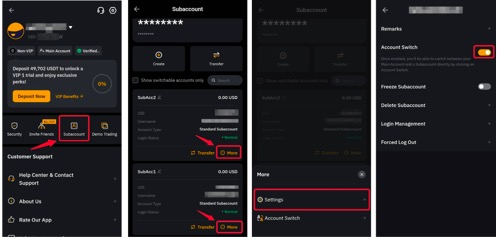 يتم تفعيل ميزة تبديل الحساب بشكل افتراضي. إذا كنت ترغب في تعطيلها من حساب فرعي، يرجى العثور على حسابك الفرعي والضغط على المزيد → الإعدادات وقم بإيقاف تفعيل ميزة تبديل الحساب.