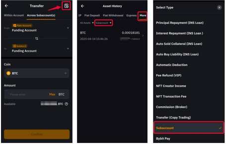 في نافذة التحويل، اضغط على رمز التاريخ في الزاوية العلوية اليمنى من شاشتك. علامة تبويب التحويل ستظهر لك جميع تحويلات الأموال التي تم إجراؤها على حسابك الرئيسي. للتحقق من سجل تحويلات حساباتك الفرعية، يرجى البحث عن علامة تبويب المزيد عن طريق السحب لليمين وفي قائمة تحديد النوع اختر الحساب الفرعي.