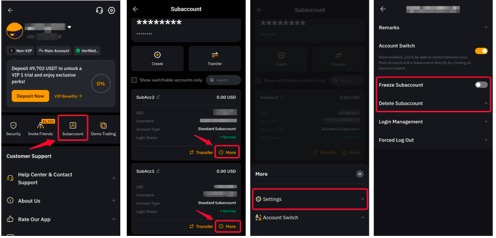 لحذف/تجميد حسابك الفرعي، عليك فتح علامة تبويب الحساب الفرعي بالنقر على صورة الملف الشخصي في الزاوية العلوية اليسرى. اضغط على زر المزيد للحساب الفرعي المعني، افتح الإعدادات وانقر على تجميد الحساب الفرعي أو حذف الحساب الفرعي.