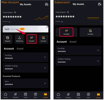يمكنك النقر على نقل في صفحة الحساب الفرعي لحسابك الرئيسي لتحويل الأصول بين أي حسابات بشكل فوري وبدون أي رسوم.